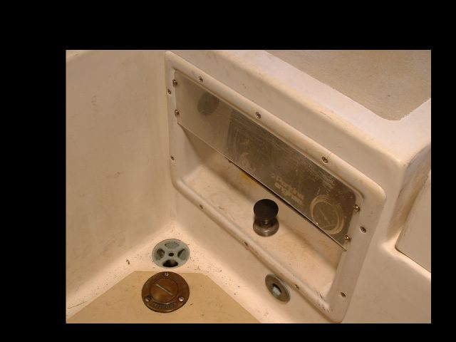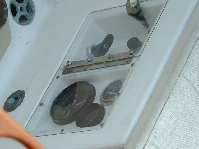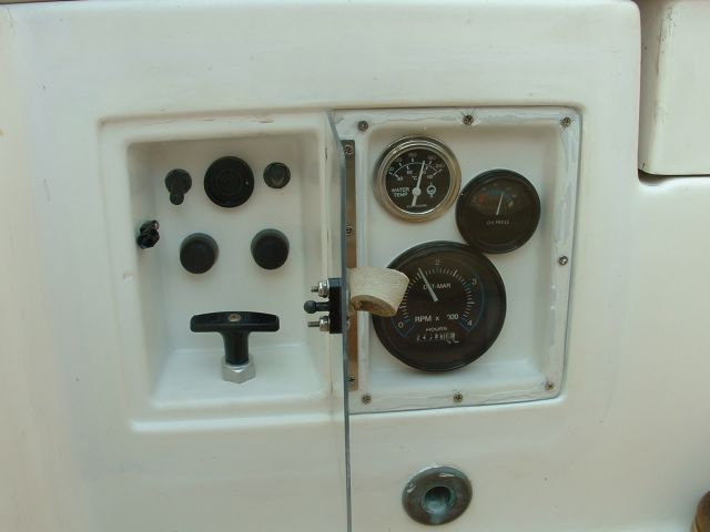 | Finally, from behind the helm the panel looks like this. I can see enough of the needles to know that the engine is running at nominal. The oil pressure looks like a little white tick mark on the picture, but it is really pretty easy to see. If it falls low, it is very easy to see. The biggest problem that I encountered was that I made the mold on a perfectly flat board. In fact the side of the cockpit is not flat. It caused me a great deal of work to try and get the flat panel to fair in with the cockpit. If I had to do it over I would make a mold of the side of the cockpit and add the wood pieces to that to make the mold for the panel. |